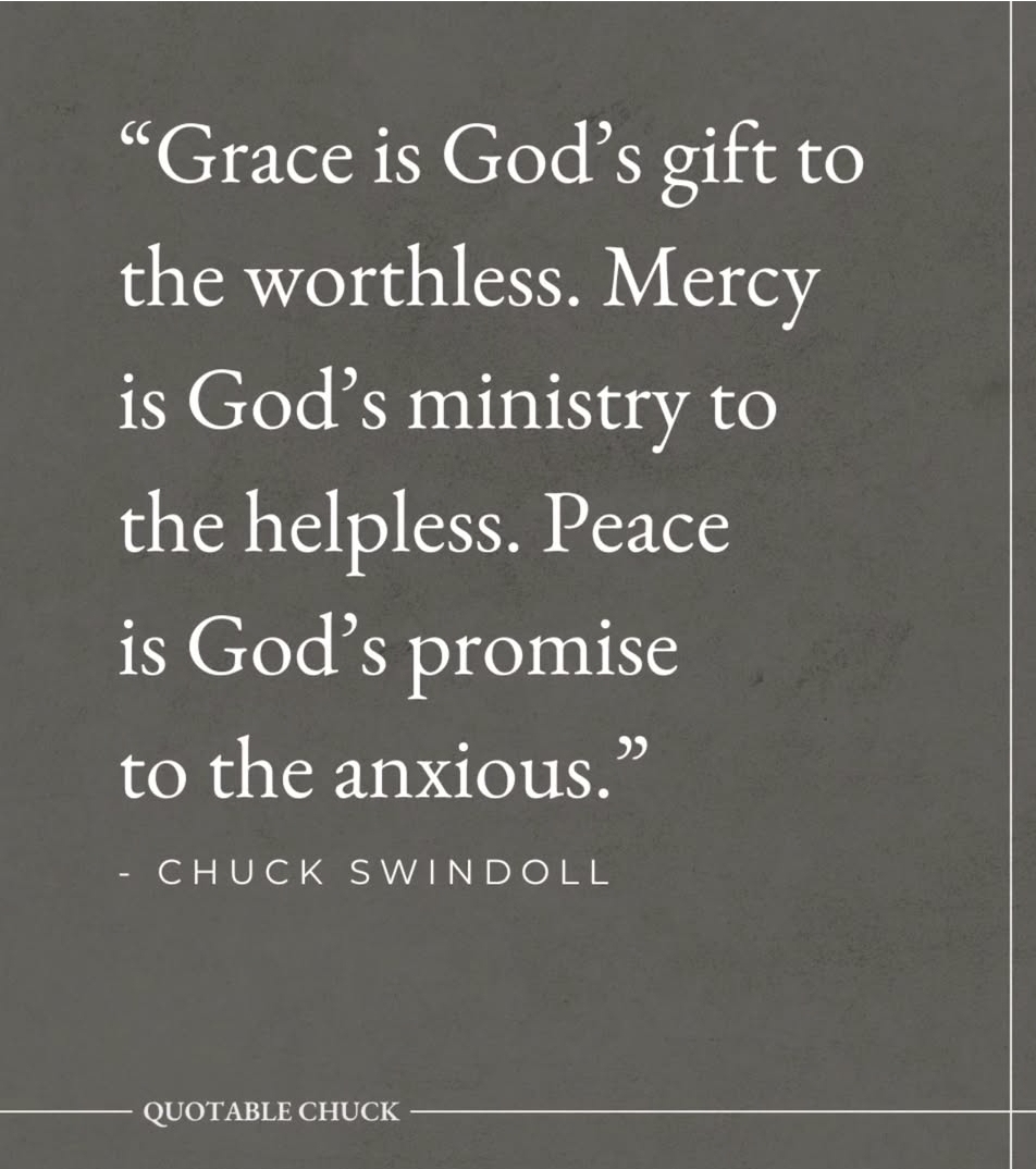 Grace is God’s gift to the worthless; Mercy is God’s ministry to the helpless; Peace is God’s promise to the anxious – Chuck Swindoll